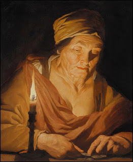 Matthias Stom ou Stomer ( 1600-1649? ), Mulher contando moedas à luz de uma vela, óleo sobre tela, 67,9x57,5cm, Col.Kremer.